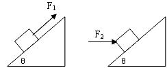 13.(10分)质量为m的物体放在倾角为θ的斜面上,设θ=45º,物体和斜面间的动摩擦因数µ=0.5,力F1沿斜面向上作用于物体或另一水平方向作用与物体的力F2均能使物体匀速上滑,如图所示,则F1:F2等于多少?