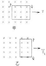 19.(8分)如图甲所示,长为a宽为b,单位长度电阻为r的均匀线框从磁感应强度为B的匀强磁场中以速度V匀速拉出,求拉力的功及PQ两点间的电势差。如果线框以图乙方式匀速拉出,为使外力的功与图甲方式相同,拉出的速度V1应为多大?此时PQ两点间的电势差多大?