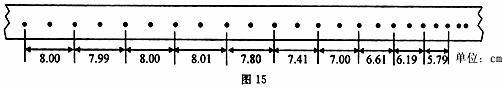 ③接通打点计时器(其打点周期为0.02s); ④使电动小车以额定功率加速运动,达到最大速度一段时间后关闭小车电源,待小车静止时再关闭打点计时器(设小车在整个过程中小车与纸带所受的阻力恒定).在上述过程中,打点计时器在纸带上所打的部分点迹如图15所示(已知纸带左端与小车相连). 请分析纸带数据,回答下列问题: