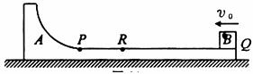 (1)求A、B相对静止时的速度大小; (2)若B最终停在A的水平部分上的R点,PR=1m,求B在圆弧上运动过程中因摩擦而产生的热量; (3)若圆弧部分光滑,且除v0不确定外其他条件不变,讨论小木块B在整个运动过程中,是否有可能在某段时间里相对地面向右运动?如不可能,说明理由;如可能,试求出B既能向右滑动、又不滑离木板v0的取值范围。(取g=10m/s2,结果可以保留根号)