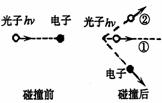 如图所示为康普顿效应示意图,光子与一个静止的电子发生碰撞,图中标出了碰撞后电子的运动方向。设碰前光子频率为v,碰后为v′,则关于光子碰后的运动方向和频率的说法中正确的是 ( )