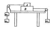 2. 如下图所示,重物A、B叠放在水平桌面上。质量分别为m1、m2、m3的物体分别通过细线跨过定滑轮水平系在重物A、B上,已知m1>m2+m3,A、B保持静止。现将m3解下放在物体A的上方,发现A、B仍处于静止。关于A、B间的摩擦力f1和B与桌面的摩擦力f2的变化情况,下列说法中正确的是 ( )