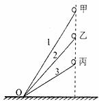 5. 有三个光滑斜轨道1、2、3,它们的倾角依次是60°,45°和30°,这些轨道交于O,现有位于同一竖直线上的3个小物体甲、乙、丙,分别沿这3个轨道同时从静止自由下滑,如下图所示,物体滑到O点的先后顺序是 ( )