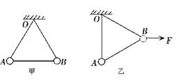 6.如图甲所示,装置中OA、OB是两根轻绳.AB是轻杆,它们构成一个正三角形。在A、B两处分别固定质量均为m的小球,此装置悬挂在O点,开始时装置自然下垂。现对小球B施加一个水平力F,使装置静止在如图乙所示的位置,此时OA竖直。设在图甲所示的状态下OB对小球B的作用力大小为T,在图乙所示的状态下OB对小球B的作用大小为T′,下列判断正确的是( )