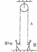 2. 质量分别为M和M+m的两个人,分别拉住定滑轮两边的绳子往上爬.开始时,两人与定滑轮的距离都是h,如图所示,设滑轮和绳子的质量及滑轮轴处的摩擦均不计。问:当质量小的人在时间t内爬到滑轮时,质量大的人与滑轮间的距离是多大?