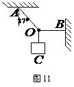 13、如图11所示,轻绳OA一端系在天花板上,与竖直线夹角为370,轻绳OB水平,一端系在墙上,O点处挂一重为40N的物体.绳AO拉力为 N、BO的拉力为 N;若绳AO、BO、CO所能承受的最大拉力均为100N,则所吊重物不能超过 N
