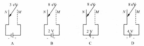 11.如下图所示,N为钨板,M为金属网,它们分别和电池两极相连,各电池的电动势E和极性已在图中标出,钨的逸出功为4.5 eV。现分别用能量不同的光子照射钨板(各光子的能量也已在图上标出),那么下列图中能有电子到达金属网的是
