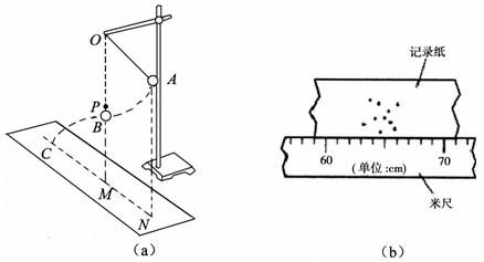 如图(a)中,悬点正下方P点处放有水平放置炽热的电热丝,当悬线摆至电热丝处时能轻易被烧断,小球由于惯性向前飞出作平抛运动.在地面上放上白纸,上面覆盖着复写纸,当小球落在复写纸上时,会在下面白纸上留下痕迹.用重锤线确定出A、B点的投影点N、M.重复实验10次(小球每一次都从同一点由静止释放),球的落点痕迹如图(b)所示,图中米尺水平放置,零刻度线与M点对齐.用米尺量出AN的高度h1、BM的高度h2,算出A、B两点的竖直距离,再量出M、C之间的距离x,即可验证机械能守恒定律.已知重力加速度为g,小球的质量为m.
