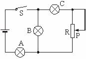 4.如下图所示,闭合开关S并调节滑动变阻器滑片P的位置,使A、B、C三灯亮度相同.若继续将P向下移动,则三灯亮度变化情况为