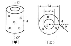 ,图(乙)是它的截面,有一束光线从玻璃管的外侧面上的A点垂直于玻璃管中心轴线射入,如图(乙)所示。