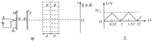 18.如下图甲所示,相距很小的平行金属板M接地,N接乙图的电压,S1、S2为正对的小孔,N右侧有两个宽度均为