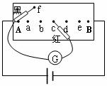 (2)在两接线柱A、B连线上等距离找出5个基准点a、b、c、d、e.灵敏电流表G的一根探针接在c点,另一探针接在f点,则电流表指针向_______端偏转(填红表笔或黑表笔)(已检验该电流表当电流从红表笔流入时指针向红表笔端偏转).为找到与c点电势相等的点,接f点的探针应向_______移动(填左或右).