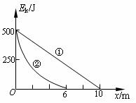 9.构建和谐型、节约型社会深得民心,遍布于生活的方方面面.自动充电式电动车就是很好的一例. 将电动车的前轮装有发电机,发电机与蓄电池连接,当电动车自动滑行时,就可以向蓄电池充电,将其他形式的能转化成电能储存起来.现有某人骑车以500J的初动能在粗糙的水平路面上滑行,第一次关闭充电装置,让车自由滑行,其动能随位移变化关系如图线①所示;第二次启动充电装置,其动能随位移变化关系如图线②所示,则第二次向蓄电池所充的电能是 ( )