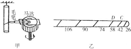 16.(6分)如下图甲所示,将包有白纸的圆柱棒替代纸带和重物,蘸有颜料的毛笔固定在马达(即电动机)上并随之转动,使之替代打点计时器。当烧断悬挂圆柱棒的线后,圆柱棒竖直自由落下,毛笔就在圆柱棒面上的纸上画出记号,测得记号之间的距离依次为