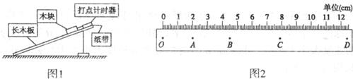 17.(4分)用铁架台将长木板倾斜支在水平桌面上,组成如下图(1)所示装置(示意图),测量木块沿斜面下滑的加速度。所提供的仪器有长木板、木块、打点计时器(含纸带)、学生电源、米尺、铁架台及导线、开关等。图(2)是打点计时器打出的一条纸带,纸带上标注了O点和几个计数点:A、B、C、D等,相邻两个计数点间还有4个点没有标出,刻度尺的零点与O点对齐。已知打点计时器所用交流电源的频率是50Hz。