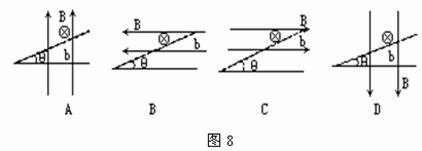 9.质量为m的通电导体棒ab置于倾角为θ的导轨上,如图7所示。已知导体与导轨间的动摩擦因数为μ,在图8所加各种磁场中,导体均静止,则导体与导轨间摩擦力为零的可能情况是:( )