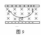 10.设空间存在竖直向下的匀强电场和垂直纸面向里的匀强磁场,如图9所示,已知一个离子在电场力和洛仑兹力的作用下,从静止开始自A点沿曲线ACB运动,到达B点时速度为零,C点是运动的最低点,忽略重力,以下说法正确的是:( )
