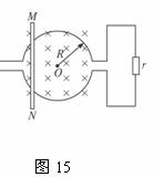 15.(B)(12分)如图15所示,半径为R的圆形导轨处在垂直于圆平面的匀强磁场中,磁感应强度为B,方向垂直于纸面向内.一根长度略大于导轨直径的导体棒MN以速率v在圆导轨上从左端滑到右端,电路中的定值电阻为r,其余电阻不计.导体棒与圆形导轨接触良好. 求: