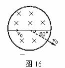 16.(A)(12分)如图16所示,带负电的粒子垂直磁场方向进入圆形匀强磁场区域,出磁场时速度偏离原方向60°角,已知带电粒子质量m=3×10