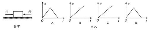 4.如图甲所示,放在光滑面上的木块受到两个水平力F1与F2的作用而静止不动,现保持F1大小和方向不变,F2方向不变,使F2随时间t均匀减小到零,再均匀增加到原来的大小,在这个过程中,能正确描述木块运动情况的图象是图乙中的 ( )
