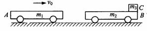 25.(20分)如下图所示,在光滑水平面的同一条直线上,有质量分别为m1、m2的小平板平A、B,两车的高度、长度均相同。一个物块C(可看作质点)放置在B车右端。物块C与B车上表面间的动摩擦因数是C与A车上表面间的动摩擦因数的一半。开始时B车静止,A车以速度v0向B车运动,在极短时间内发生正碰,并粘在一起不再分开。物块C最终恰好在B车中央停止相对滑动。