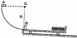 圆弧形光滑轨道,已知轨道底端的切线水平,且高度与车表面相平。现有另一木块A(木块A、B可视为质点)从圆弧轨道的顶端由静止释放,然后滑行到车上与B发生碰撞。两木块碰撞后立即粘在一起在平板车上滑行,并与固定在平板车上的水平轻质弹簧作用后被弹回,最后两木块刚好回到车的最左端与车保持相对静止。已知木块A的质量为m,木块B的质量为