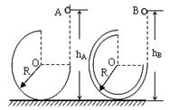 10.如图所示,两个3/4圆弧轨道固定在水平地面上,半径R相同,A轨道由金属凹槽制成,B轨道由金属圆管制成,均可视为光滑轨道。在两轨道右侧的正上方分别将金属小球A和B由静止释放,小球距离地面的高度分别用hA和hB表示,对于下述说法,正确的是( )