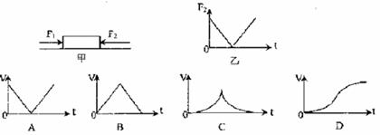 5.如图甲所示,放在光滑平面上的木块受到两个水平力F1与F2的作用静止不动。现保持F1不变,使F2逐渐减小到零,再逐渐恢复到原来的大小,其大小变化图象如图乙所示,则在此过程中,能正确描述木块运动情况的图象是 ( )