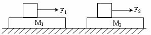 12.如图所示,在光滑水平面上,放着两块长度相同,质量分别为M1和M2的木板,在两木板的左端各放一个大小、形状、质量完全相同的物块,开始时,各物均静止,今在两物体上各作用一水平恒力F1、F2,当物块和木块分离时,两木块的速度分别为v1、v2,物体和木板间的动摩擦因数相同,下列说法中正确的是
