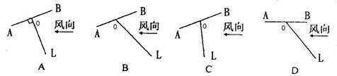 表风筝截面,OL代表风筝线,风向水平,风筝质量不可忽略,风筝可能静止的是( ) ![]()