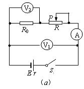 12.两位同学在实验室利用如图(a)所示的电路测定定值电阻R0、电源的电动势E和内电阻r,调节滑动变阻器的滑动触头P向某一方向移动时,一个同学记录了电流表A和电压表V1的测量数据,另一同学记录的是电流表A和电压表V2的测量数据.并根据数据描绘了如图(b)所示的两条U―I直线.回答下列问题: