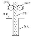 17.(8分)如图是建筑工地上常用的一种“深穴打夯机”示意图,电动机带动两个滚轮匀速转动将夯杆从深坑提上来,当夯杆底端刚到达坑口时,两个滚轮彼此分开,将夯杆释放,夯杆在自身重力作用下,落回深坑,夯实坑底。然后两个滚轮再次压紧,夯杆被提上来,如此周而复始(夯杆被滚轮提升过程中,经历匀加速和匀速运动过程)。已知两个滚轮边缘的线速度恒为v=