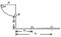 22.如下图,位于竖直平面内的四分之一光滑圆弧轨道半径为R。轨道底端距地面的高度为H。质量为m的B球静止在圆弧轨道的底端。将质量为M的A球从圆弧轨道上的某点由静止释放。它沿轨道滑下后与B球发生正碰。A、B两球落地时,水平通过的距离分别是s1和s2。已知M>m,重力加速度为g。不计空气阻力。