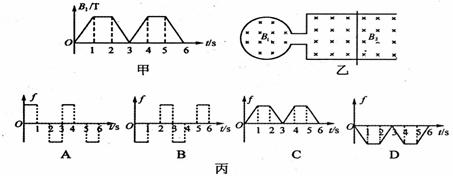 11.在水平桌面上,一个面积为S的圆形金属框置于匀强磁场中,线框平面与磁场垂直,磁感应强度B1随时间t的变化关系如图甲所示。0~1s内磁场方向垂直线框平面向下。圆形金属框与一个水平的平行金属导轨相连接,导轨上放置一根导体棒,导体棒的长为L、电阻为R,且与导轨接触良好,导体棒处于另一匀强磁场中,其磁感应强度恒为B2,方向垂直导轨平面向下,如图乙所示。若导体棒始终保持静止,则其所受的静摩擦力f随时间变化的图象是丙图中的(设向右为静摩擦力的正方向) ( )
