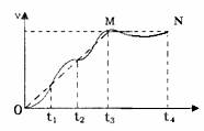 4.某人骑自行车在平直道路上运动,图中的实线表示自行车开始一段时间内的v―t图象。某同学为了简化计算,用虚线OMN做近似处理,下列说法正确的是 ( )