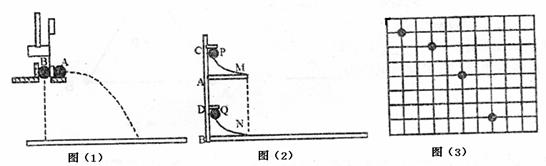 (2)乙同学采用如图(2)所示的装置。两个想通的弧形轨道M、N分别用于发射小铁球P、Q,其中N的末端与可看作光滑的水平板相切;两轨道上端分别装有电磁铁C、D;调节电磁铁C、D的高度,使AC=BD,从而保证小铁球P、Q在轨道出口处的水平初速度v0相等,现将小铁球P、Q分别吸在 电磁铁C、D上,然后切断电源,使两小铁球能以相同的初速度v0同时分别从轨道M、N下端射出。实验可观察到的现象应是 。仅仅改变弧形轨道M的高度(保持AC不变),重复上述实验,仍能观察到相同的现象,这说明 。