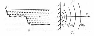 ,式中h为水的深度,g为重力加速度。为验证上述关系式,采用剖面图如图甲所示一个水箱,A、B两部分深度不同,图乙是从上往下俯视,看到从P处向外传播的水波波形(弧形实线代表波峰)。若一直A处水深为