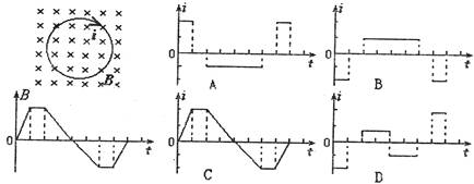9.如图,圆环形线圈处在匀强磁场中,磁场方向与环面垂直,磁感应强度随时间变化规律 如B―t图象所示。图中所标的磁场方向和感应电流方向为正方向,则下面i―t图中正确的是 ( )