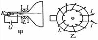 10.如图所示,图甲为电视机显像管的结构示意图,其左端尾部是电子枪,阴极发射的“热电子”经过电压U加速后形成电子束,向右高速射出。在显像管的颈部装有两组相互垂直的偏转线圈L,图乙是其中一组“纵向”偏转线圈从右侧向左侧看去的示意图,当偏转线圈中有图示方向的电流时,在显像管颈部形成水平向左(即甲图中垂直纸面向外)的磁场,使自里向外(即甲图中自左向右)射出的电子向上偏转;若该线圈中的电流反向,电子则向下偏转。改变线圈中电流的大小,可改变偏转线圈磁场的强弱,电子的纵向偏转量也随之改变。这样,控制加在“纵向”偏转线圈上的交变电压,就可控制电子束进行“纵向”(竖直方向)扫描。同理,与它垂直的另一组“横向”偏转线圈,通入适当的交变电流时,则能控制电子束进行“横向”(水平方向)扫描。这样,两组偏转线圈可控制电子束反复在荧光屏上自上而下、自左而右的扫描,从而恰好将整个荧光屏“打亮”。若发现荧光屏出现一条水平亮带(即竖直幅度变小,水平幅度正常),则可能是下列哪些因素引起的 ( )