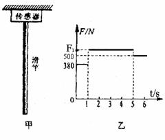 13.(11分)(如图甲所示为学校操场上一质量不计的竖直滑杆,滑杆上端固定,下端悬空,为了研究学生沿杆的下滑情况,在竿的顶部装有一拉力传感器,可显示竿顶端所受拉力的大小,现有一学生(可视为质点)从上端由静止开始滑下,5s未滑到竿底时速度恰好为零,从学生开始下滑时刻计时,传感器显示拉力随时间变化情况如图乙所示,g取