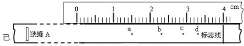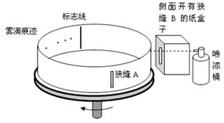 在转台开始转动达到稳定转速时,向侧面同样开有狭缝B的纸盒中喷射油漆雾滴,当狭缝A转至与狭缝B正对平行时,雾滴便通过狭缝A在纸带的内侧面留下痕迹。改变喷射速度重复实验,在纸带上留下一系列的痕迹a、b、c、d。将纸带从转台上取下来,展开平放在刻度尺旁边,如图所示。