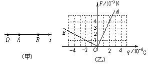 11.如图(甲)所示,在x轴上有一个点电荷Q(图中未画出),O、A、B为轴上三点。放在A、B两点的检验电荷受到的电场力跟检验电荷所带电荷量的关系如图(乙)所示。以x轴的正方向为电场力的正方向,则 ( )