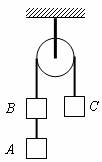14.如图所示,质量不计的细绳跨过无摩擦的定滑轮上,细绳两端系有A、B和C三物体,若A、B和C三物体的质量均为m,重力加速度为g,则连结A、B细绳上的张力为 ( )