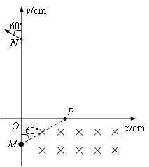撤除,重新加上的电场或磁场与撤除前的一样.其中匀强磁场B1的方向垂直纸面向里,大小为B1=1T;第一象限的某个矩形区域内,有方向垂直纸面向里的匀强磁场B2,磁场的下边界与x轴重合.一带正电微粒以某一速度沿与y轴正方向60°角从M点进入第四象限,若此空间只有电场,粒子将经过Q点;若同时存在电场和磁场,粒子恰好沿直线MP运动,经P点即进入处于第一象限内的磁场B2区域.一段时间后,小球经过y轴上的N点并与y轴正方向成60°角的方向飞出.M点的坐标为(0,-10),N点的坐标为(0,30),Q点的坐标为(10