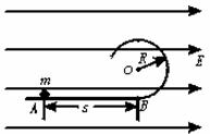 25.如下图所示,一半径为R的绝缘圆形轨道竖直放置,圆形轨道的最低点与一水平轨道相连,轨道都是光滑的,轨道所在的空间存在水平向右的匀强电场,场强为E.从水平轨道上的A点由静止释放一质量为m的带正电的小球,为使小球刚好能在竖直面内做圆周运动,求释放点A距圆轨道最低点B的距离s.(已知小球受到的电场力大小等于小球重力的
