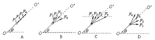 5.如下图所示,小车沿水平面向右做加速直线运动,车上固定的硬杆和水平面的夹角为θ,杆的顶端固定着一个质量为m的小球。当车运动的加速度逐渐增大时,杆对小球的作用力(F1至F4变化)的受力图形(OO′沿杆方向)可能是图中的 ( )