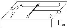 的平行光滑金属导轨ab与cd,阻值为R的电阻与导轨的a、c端相连。金属滑杆MN垂直于导轨并可在导轨上滑动。整个装置放于匀强磁场中,磁场的方向竖直向上,磁感应强度的大小为B。滑杆与导轨电阻不计,滑杆的中点系一不可伸长的轻绳,绳绕过固定在桌边的光滑轻滑轮后,与一质量为m的物块相连,拉滑杆的绳处于水平拉直状态。现若从静止开始释放物块,用I表示回路中的感应电流,g表示重力加速度,则在物块下落过程中物块的速度可能 ( )