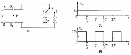 ,板间距离为d,开关S接1。当t=0时,在a、b两端加上如图乙所示的电压,同时在c,d两端加上如图丙所示的电压。此时,一质量为m的带负电微粒P恰好静止于两孔连线的中点处(P、