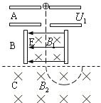 18.(9分)如图所示为质谱仪的原理图。A为粒子加速器,两板间的电压为U1;P为速度选择器,磁场与电场正交,磁感应强度为B1,板间距离为d;C为偏转分离器,磁感应强度为B2。今有一质量为m,电荷量为q的正离子(重力不计)由静止开始经粒子加速器加速后,恰能沿直线通过速度选择器,进入分离器后做匀速圆周运动。求: