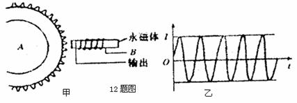 12.现代汽车在制动时,有一种ABS系统,它能阻止制动时车轮抱死变为纯滑动。这种滑动不但制动效果不好,而且易使车辆失去控制。为此需要一种测定车轮是否还在转动的装置。如果检测出车辆不再转动,就会自动放松制动机构,让轮子仍保持缓慢转动状态。这种检测装置称为电磁脉冲传感器,如图甲,B是一根永久磁铁,外面绕有线圈,它的左端靠近一个铁质齿轮,齿轮与转动的车轮是同步的。图乙是车轮转动时输出电流随时间变化的图象,下面分析正确的是
